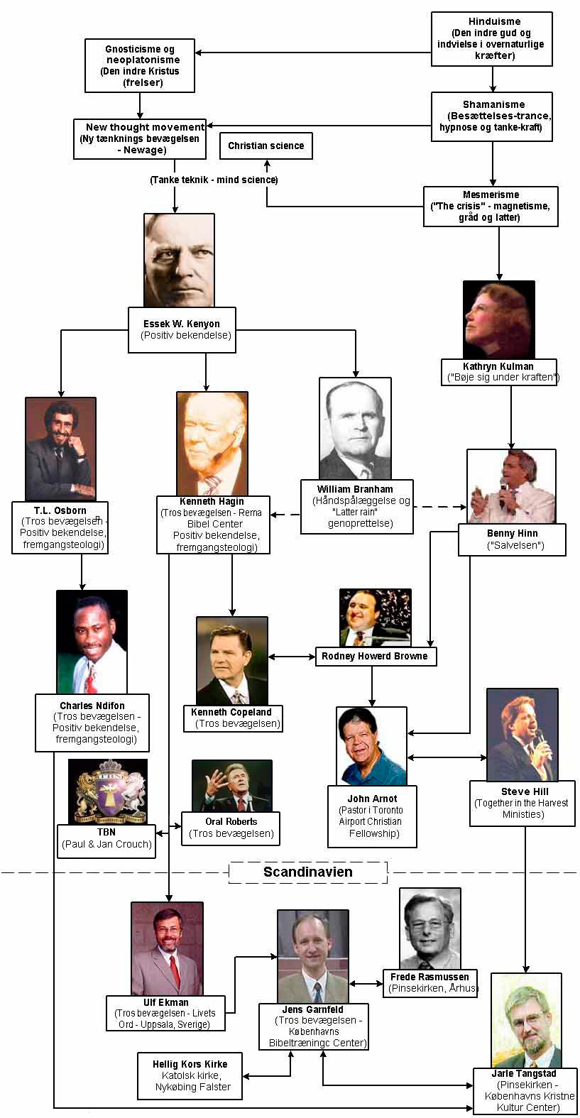 Enhver der er, eller har været en del af det danske kirkeliv ved, at menighederne påvirkes af læren og bevægelserne fra USA. Som New Ager Jeremy Rifkin siger (tidligere citeret): ”det er de amerikanske evangeliske kristne som spiller hovedrollen i det skift der nu forgår i protestantisk doktrin”. Det er et faktum at Amerikas religiøse ledere spiller en stor rolle, og i sin tid, da jeg begyndte at se det, lavede jeg følgende oversigt: