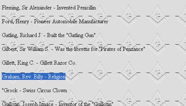 [16] Graham blev vist på denne side http://www.la-mason.com/famous.htm, og på denne www.gl-mi.org/lodges/genesee-174.minfo.html - som ikke eksisterer mere.