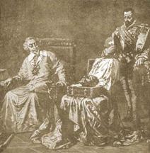 ![]() | Kardinalen af Lorraine modtager Colignys hoved i 1572 (”Ridpath’s Universal History” Vol XIII, s. 255) |