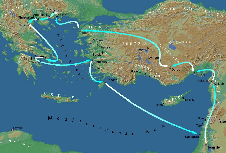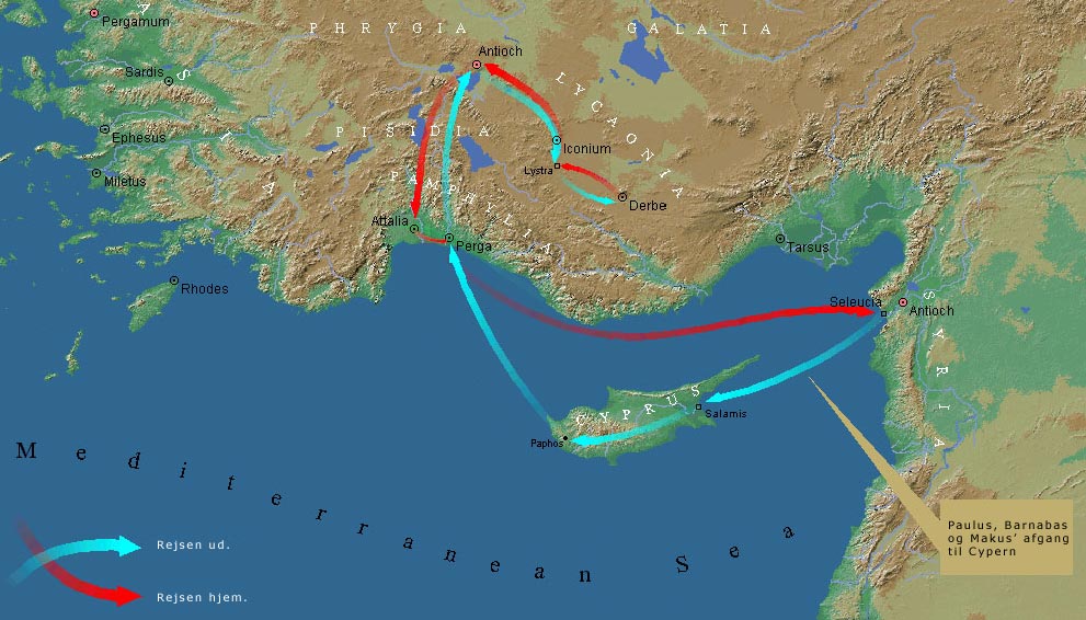 Paulus første missionsrejse, startede i Antiokia i Syrien og gik til Seleukia, til Salamis på Cypern, til Pafos, til Perke i Pamfylien, til Antiokia i Pisidien, til Lykaonien, til Lystra i Ikonion, til Derbe.