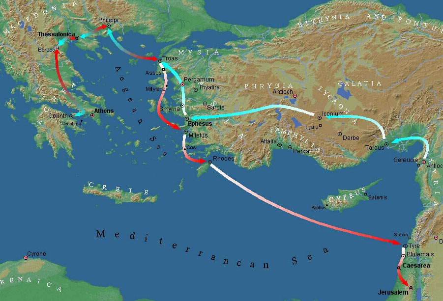 Derefter gik turen hjem til Lystra, til Ikonion, til Antiokia i Pisidien, til Perke, til Attalia og til sidst Antiokia i Syrien. (Ap.g. kap. 13-14)