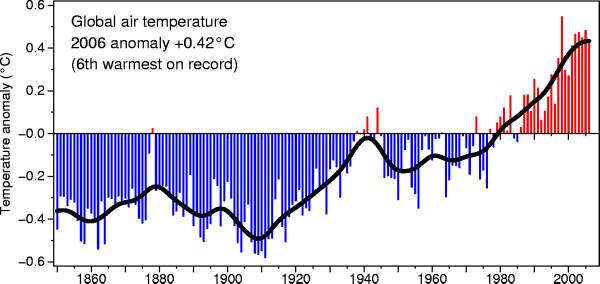 Som du kan se, starter målingen i 1850, perioden, mener flere forskere, hvor klimaet har været koldest de sidste 8.000 år*. Alene det, at begynde indsamlingen af data på det koldeste tidspunkt, hvor det ikke kan blive koldere, og så finde en synder som er årsag til at det bliver varmere, er tåbeligt useriøst. Man er nødt til at vente og finde yderpunkterne for varme og kulde, før man kan tale om anormaliteter. Der findes ikke sådanne målte data fra før 1850, men ifølge denne graf, bliver det koldere fra 1850-1862, hvorefter der bliver varmere, med et stort udsving i 1878. Herefter bliver det igen koldere indtil 1911, hvor det igen bliver varmere. I 1937-1946 er der stigende plusgrader, med enkelte udsving under minuspunktet, hvorefter det igen bliver koldere. I nyere tid, kan vi se at kurven svinger op på plusgraderne, og topper i 1998, og er i 2005 ca. 0.14 grad køligere.