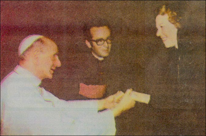 Som belønning for hendes fremragende arbejde, blev hun bevilliget en privat audiens hos paven. Når en person bliver bevilliget en sådan audiens, må han eller hun bukke sig ned, og anerkende paven som Jesus Kristus på jorden. For dette holder han deres hænder i en speciel velsignelse, for et arbejde, vel gjort.