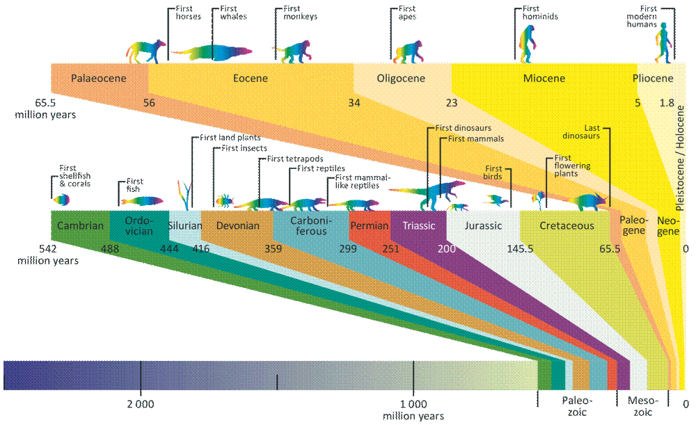 Dette afsnit er nok det vigtigste i denne artikel, fordi den geologiske tidsskala, eller geologiske kolonne, er et evolutionært mesterstykke. Der refereres til denne tidsskala som værende et absolut målebånd til at datere Jordens alder. Når alt andet fejler, er dette grundprincippet hvorpå alt evolutionær påstand hviler. Det er til denne tidsskala det kræves af evolutionisterne de vender sig til, når ryggen er imod muren. Richard Dawkins skrev i 1986 at: ”der er visse ting om den fossile optegnelse som enhver evolutionist skal forvente at være sandt. Vi bør være meget overraskede, for eksempel, over at finde fossile mennesker i optegnelsen før pattedyr formodes at have udviklet sig! Hvis et enkelt, godt verificeret kranium fra et pattedyr dukkede op i 500 millioner år gamle klipper, vil hele vores moderne evolutionsteori være ødelagt”[47]. Hele den evolutionære teori afhænger af denne tidsskala. Med dateringsmetoderne jeg lige har gennemgået, har ”videnskaben” på ingen måde mulighed for at datere Jorden til 4,5 milliarder år, så derfor er denne tidsskala deres absolutte bevis. Se dateringerne herunder: