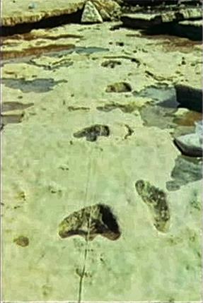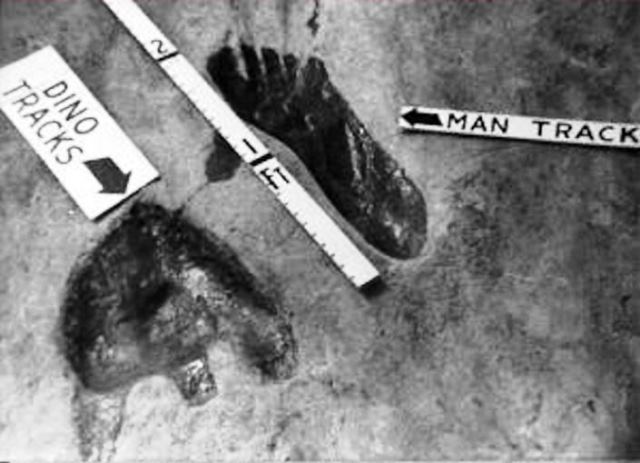 Der er også de meget omstridte ”Paluxy Spor”, der blev fundet i Texas i Paluxy floden som løber igennem byen Glen Rose, i det, der nu hedder ”Dinosaur Valley State Park”. Der er i den flod mange lag af kalksten, hvori der efter en voldsom oversvømmelse, som rev ca. 60 cm af det øverste lag kalksten med sig så laget derunder blev blottet, blev fundet tusindevis af dinosaurspor, ”112 millioner år gamle”. Sammen med disse spor i denne dinosaur park, blev der fundet 35-50 cm lange fodspor fra mennesker (se eks. på billedet). Carl Baugh (Charles Baugh) var én af dem, der fandt disse spor, og siden har evolutionister gjort alt for at tilsmudse hans person. Men sporene er der! Se et interview af ham her - SE DET!: