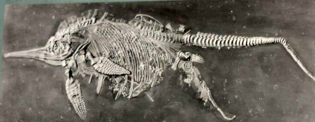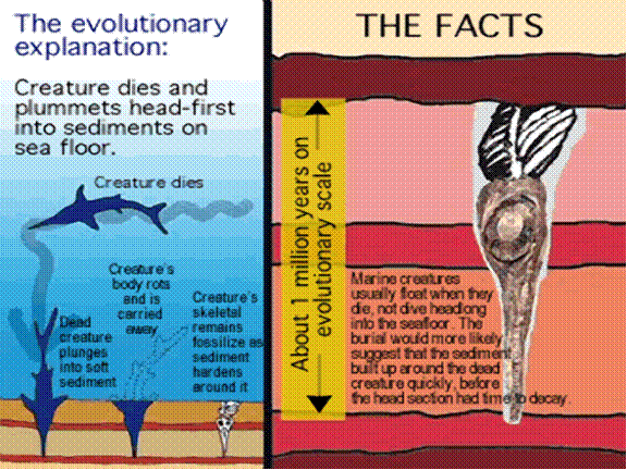 Når de kikker på jordlagene, er der flere lag af ensartet sandsten og kalksten. De kan ikke se forskel på det, om det er 100 millioner år gammel kalksten fra juratiden eller 600 millioner år gammel kambrisk kalksten. Derfor er de nødt til at bruge den uvidenskabelige teknik, cirkulær ræsonnement, og må datere ud fra de fossil-fund de selv har givet en fiktiv alder ud fra de jordlag, de ikke kan datere - alt sammen for at give evolutionen nok tid. Dertil kommer problematikken med polystrate (flerlags) fossiler. Det er ofte træer der strækker sig igennem millioner af år i den geologiske tidsskala. Evolutionisterne har selvfølgelig sine forklaringer, f.eks. at det er trærødder der har gennemboret lagene, men der er tale om kæmpe stammer, som burde være rådnet væk i løbet af de mange hundredetusinder af år de ventede på at jordlagene skulle krybe op omkring sig. Når det så viser sig at nogle træer, uden rødder, strækker sig igennem lagene - på hovedet! - så bliver sagen endnu sværere at forklare[53]. Træerne er blevet brækket med magt og vendt på hovedet, hvilket naturligt ville ske under syndfloden. I 1999 fandt man et 37 cm ichthyosaur fossil, i et forladt stenbrud i Schweiz, ved Hauenstein. Denne ichthyosaur var begravet i en 90 graders vinkel ned igennem jordlag der svarer til ca. 1 million år - vel at mærke ifølge den opdigtede geologiske tidsskala. Det vil sige, at hvis denne tidsskala er korrekt, blev denne ichthyosaur’s næse, eller næb, begravet 1.000.000 år før hoved og nakke. Evolutionisterne siger selvfølgelig at den er død et godt stykke oppe ved vandoverfladen, og da lungerne blev fyldt med vand, styrtede den hastigt mod havbunden og penetrerede strataene. Men hvordan i al verden er det lykkes at gennembore mange hundredtusinde år gamle jordlag - hårde som sten? Næbet burde være brækket og splintret hvis den havde så meget fart på…