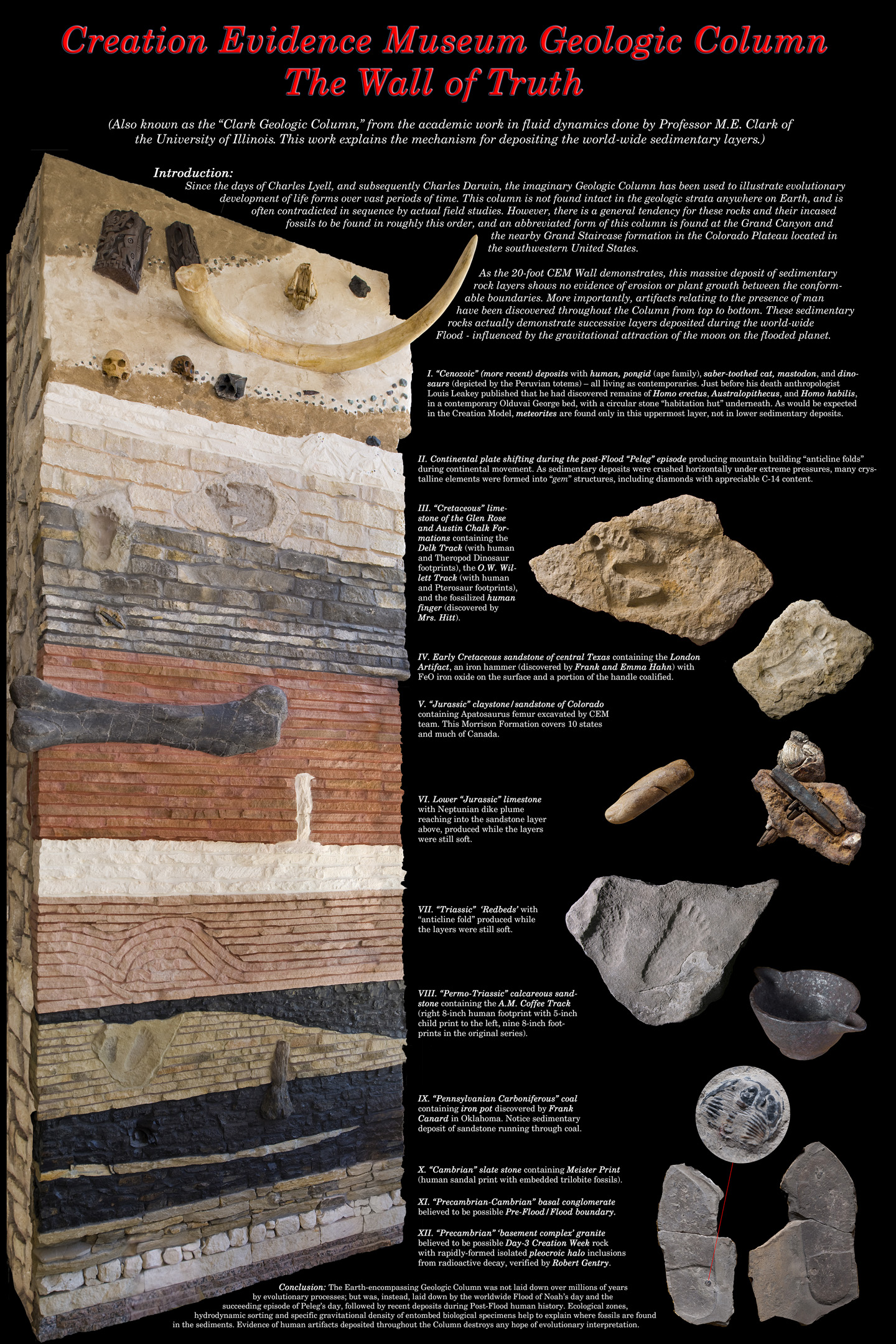 Selvom evolutionisterne utrætteligt insisterer på at denne geologiske tidsskala findes, så findes den kun i teorien og i lærebøgerne - den er ikke en virkelighed. Der er mange, mange flere fund der ødelægger teorien end jeg viser her, og som da farisæerne ville sætte mundkurv på disciplene fordi de kaldte Jesus Kongen der kommer i Herrens navn, sagde Jesus: ”hvis disse tier, skal stenene råbe” (Luk. 19:40). Hvad kan man sige? Disciplene tav, og stenene vidner stadig. Se denne ”sandhedsvæg” fra Creation Evidence Museum, der viser tidsskalaen med nogle af de forskellige fund placeret hvor i lagene de blev fundet[54].