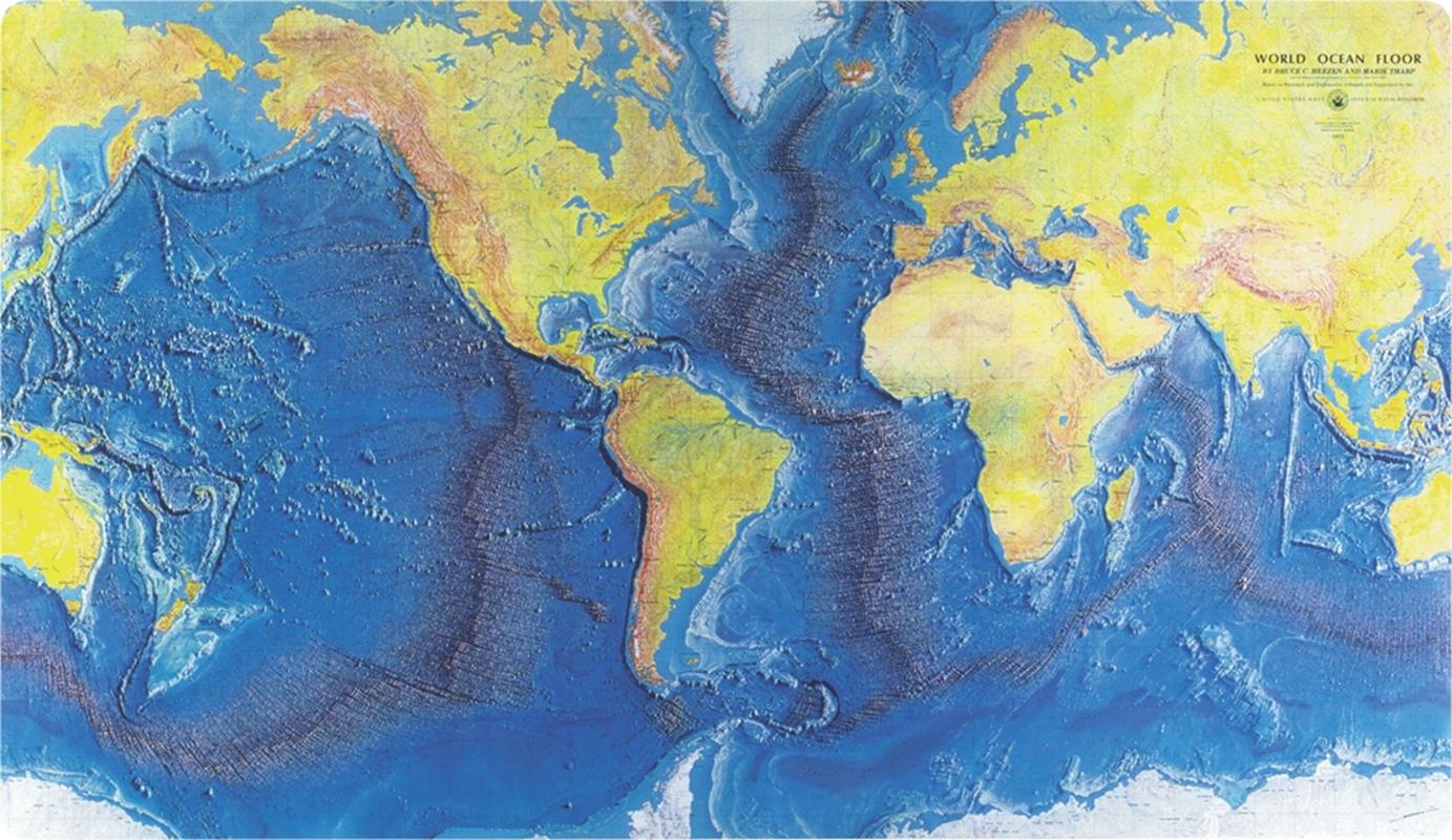 Dette billede viser med de ru afmærkninger bjergene under vandet. Walter Brown har i sin bog et lignende billede, hvor han forklarer at der i 1950 blev opdaget en bjergkæde under vandet i middelhavet (imellem Sydamerika og Afrika), der med sine 74.000 km er verdens længste bjergkæde. Ifølge teorien er kæden blevet dannet som følge af den enorme styrke vandet under jordskorpen ville være blevet presset op med[56]. ”Videnskaben” mener de er lavet ved vulkanudbrud, hvilket kan være sandt i nogle tilfælde, men lytter man til klodens vidnesbyrd om en syndflod, hvor verdensdybet åbnede sig og vand kom op og dækkede jorden (Sal. 104:6), så vil det nødvendigvis lave lignende ar i jordskorpen.