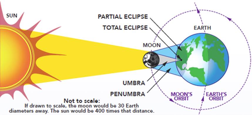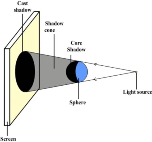 3) Månens skygge vil være meget større på Jorden, for en skygge vil altid være større end objektet selv! Se denne illustration: