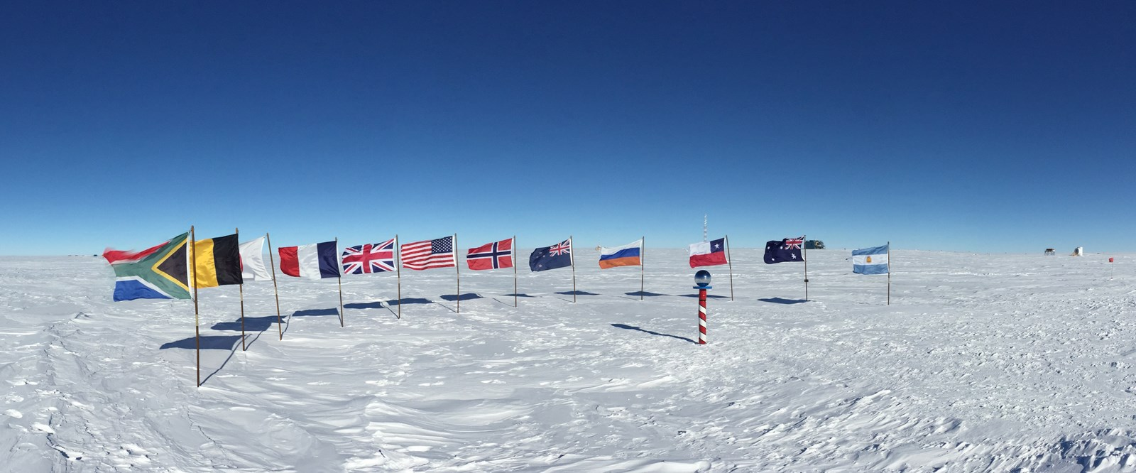 Al mystikken om at krydse Sydpolen, forsvinder for de mennesker der har rejst de ca. 1.200 km., ind over indlandsisen. De støder nemlig på Amundsen-Scott Sydpol Station, én af de mange stationer på Antarktis, og den ligger ved det, der kaldes den Ceremonielle Sydpol, 180 meter fra den geografiske sydpol[13]. Iblandt de mange der har taget rejsen er Antony Jinman, og her er et billede fra ekspeditionen[14] han deltog i, hvor flag fra Amerika, England, de Kanariske Øer, Chile, Australien og Argentina ses banket i isen.