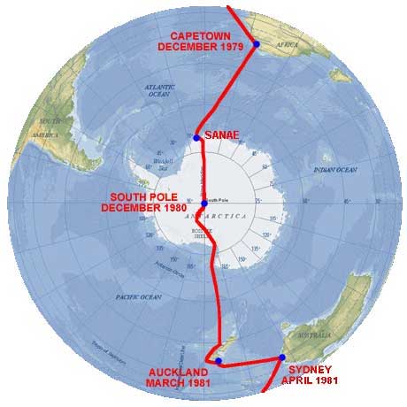Fra 1979-1982 ledte Ranulph Fiennes et ekspeditionshold Jorden rundt fra pol til pol - Transglobe Expedition hed ekspeditionen[16]. De krydsede Antarktis via sydpolen, på en 67 dages rute, der vises på dette kort: