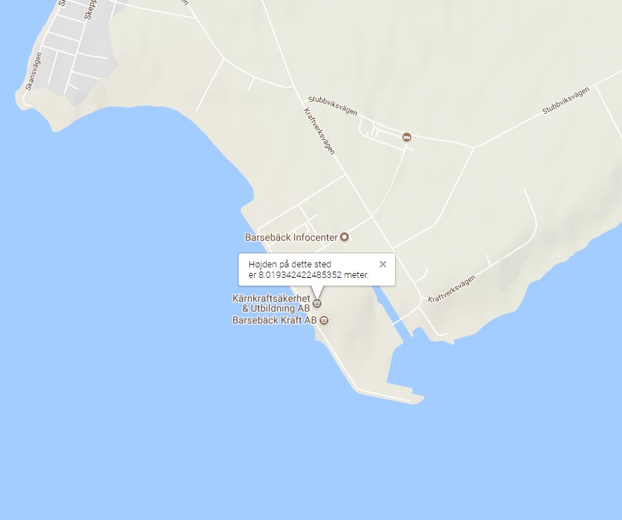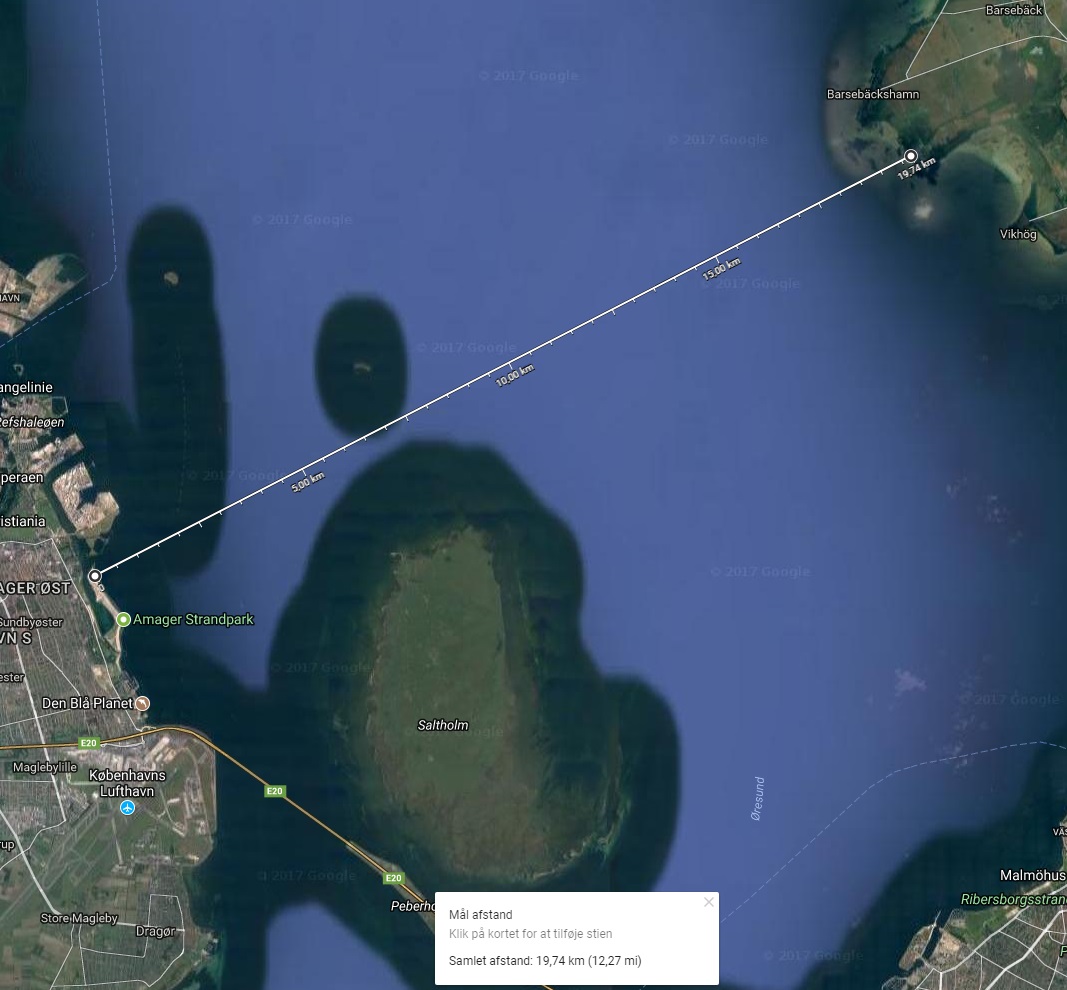 Jeg står ca. 0,5 meter over havoverfladen og tager ovenstående billede, og så skulle 19.07 meter af Barsebäck være skjult for mig, hvis Jorden er rund. Men, der er højdeforskelle på landjorden også, og med Googles højdeservice, som viser at bygningerne ligger 8 meter over havets overflade, ses at der kun er 4,86 meter der skjules for mig[22]. Jeg kan ikke se kystlinjen, men jeg kan se alt over 4,86 meter.