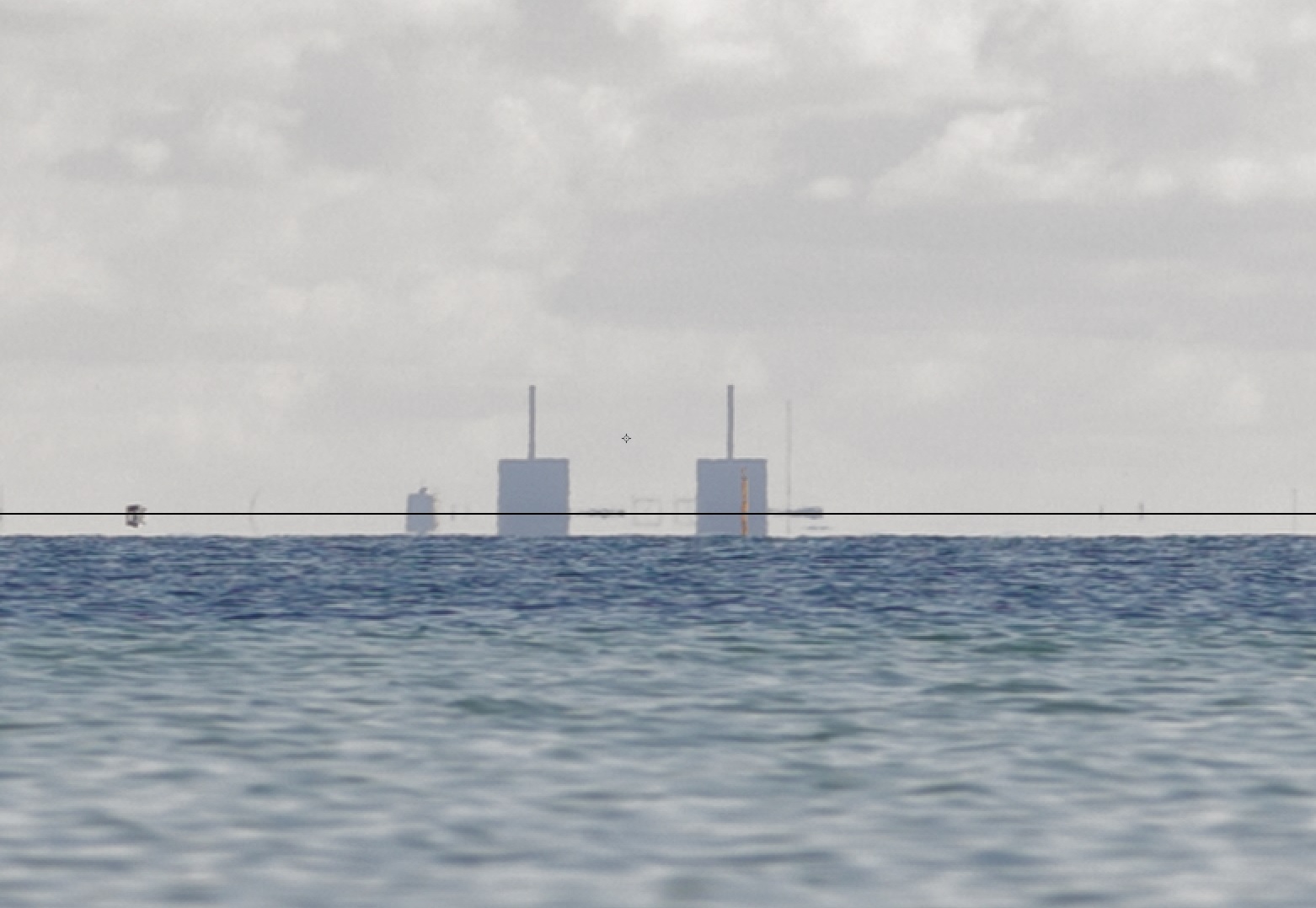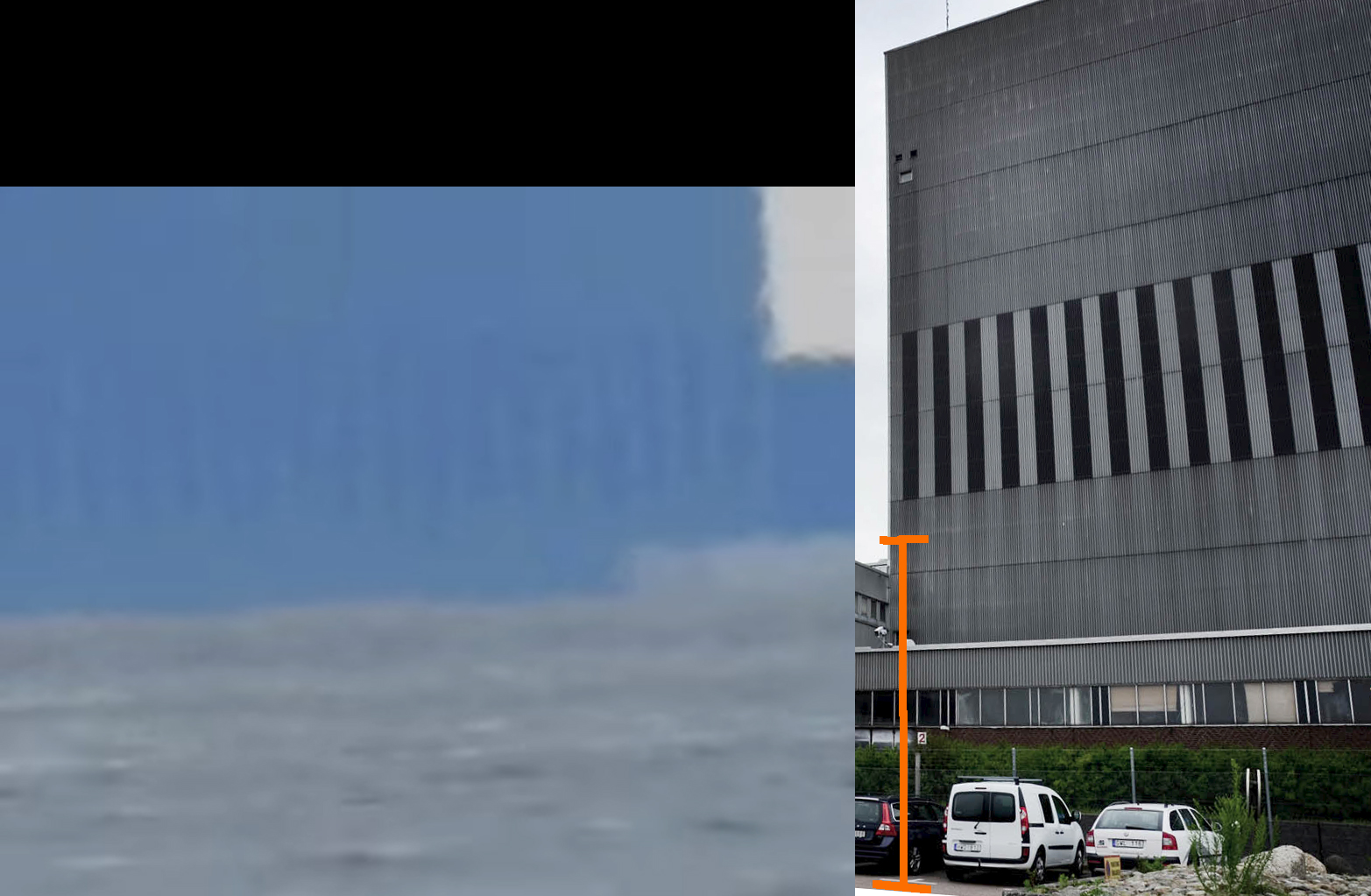 Det, der ses her, dog noget uskarpt på billedet til venstre, er tremmerne på Barsebäcks ene reaktor, og den orange streg på billedet til højre, er det som Jordens krumning skjuler, omkring 5 meter som beregnet.