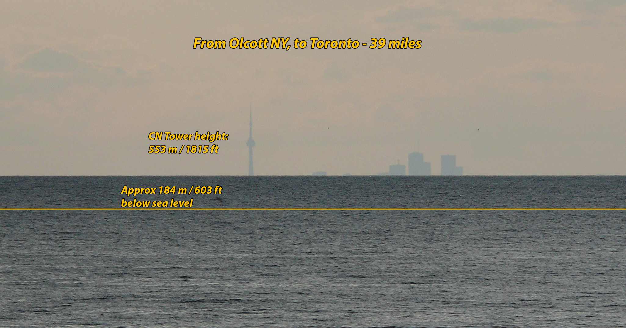 Det er samme sag med det ikoniske CN Tower, 553,33 meter højt. Toronto ligger mellem 75 og 209 meter over havoverfladen, og CN Tower er bygget på landjord der hæver sig 175 meter over havoverfladen. Derfor kan man se så meget af byen fra Olcott, New York, på den anden side af Lake Ontario[24]. Men der er meget der skjuler sig bag Jordens kurve: