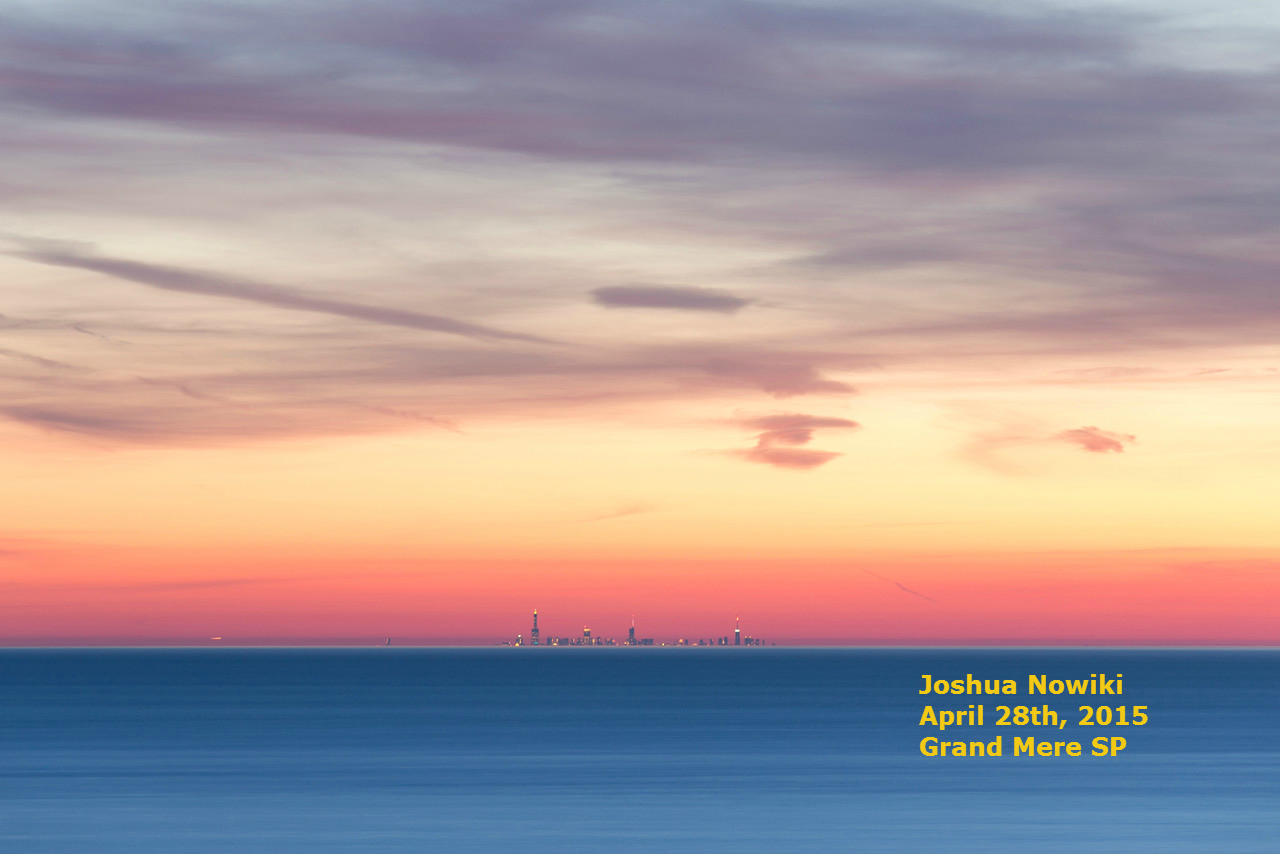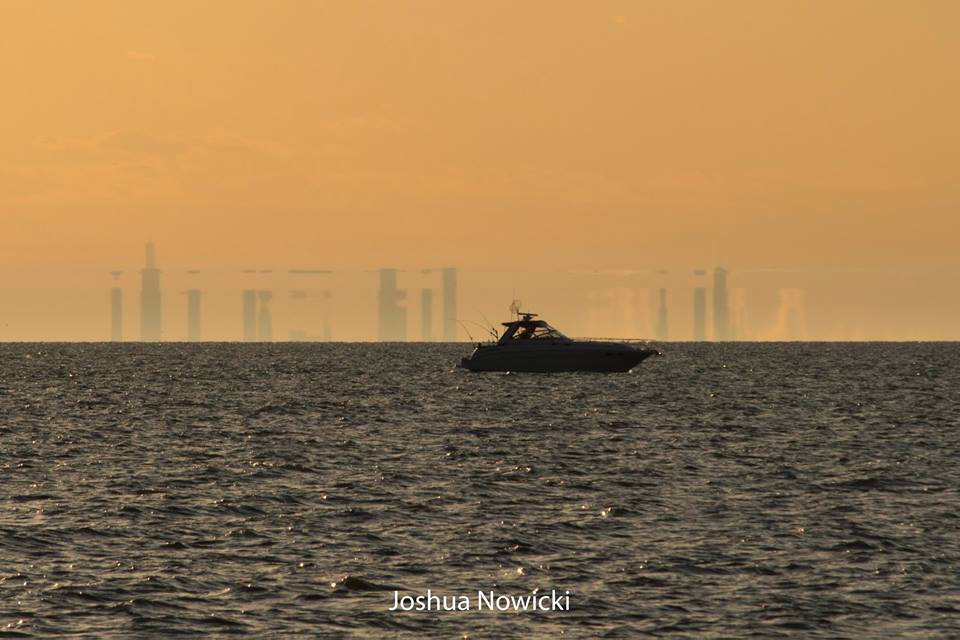 Byen burde være fuldstændig skjult bag horisonten, men her ses bygninger næsten helt fra grunden af. Det er samme fænomen, hvor det omvendt af billedet jeg tog af Barsebäck, ikke ses på hovedet. Normalt kan man ikke se hele byen, kun en del af de højeste bygninger. Men denne dag, hvor Joshua Nowicki tog dette billede, forårsagede en kold luft over Lake Michigan at lyset fra Chicago blev bøjet ned mod fotografen, Nowicki - lysstrålerne bøjes omkring Jordens runding - se illustrationen her[25]: