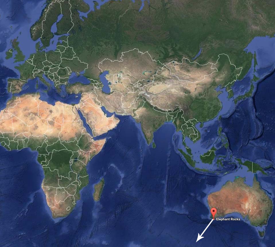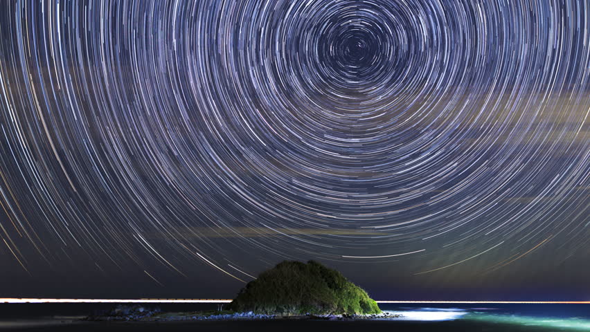 Her er et lang-eksponerings billede af stjernehimmelen[27], taget fra Elepant Rocks i Australien, og man kan undre sig hvordan stjernerne kan komme så tæt på Jorden uden at falde ned - endda ned under Jorden, på trods af at de er bundet til en hvælving der ikke går ud over, men omkranser Jorden. Stjerne-cirklen du ser, er langt større end det, et kamera kan fange. Jo større cirklen er, jo længere ned bag horisonten skal man kunne se, for at se den fulde cirkel.
