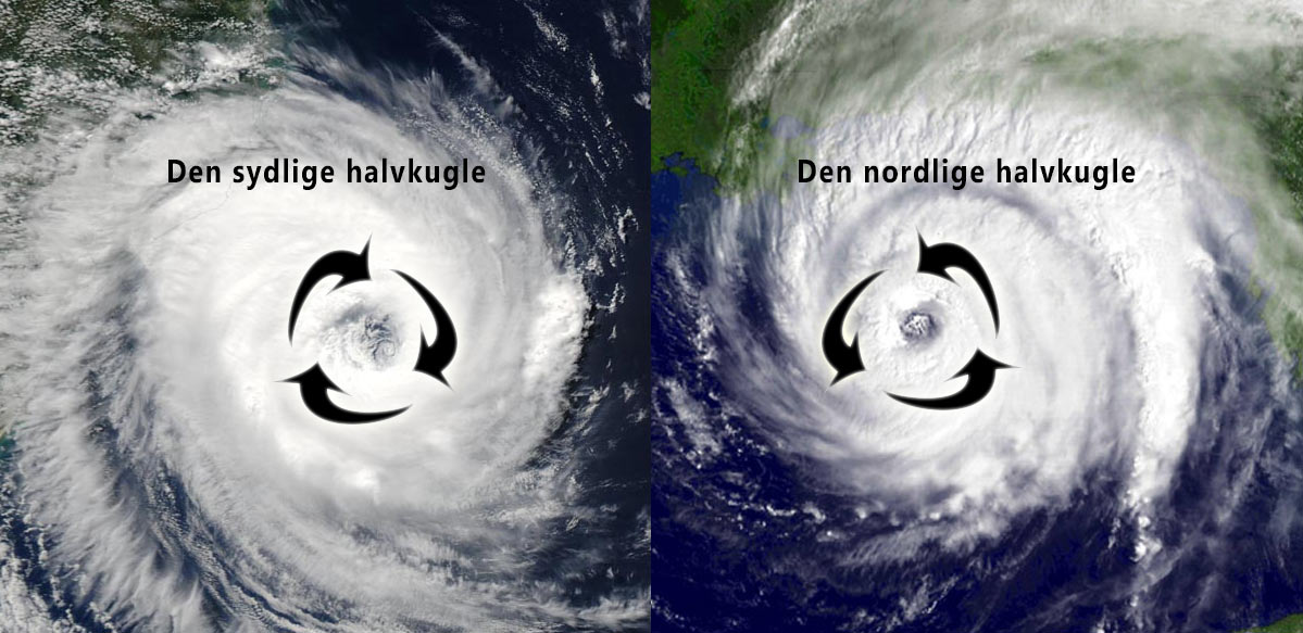 På den nordlige halvkugle, drejer orkaner fra højre mod venstre - med uret, mens de drejer fra venstre mod højre (mod uret) på den sydlige halvkugle. Årsagen er, at rotationshastigheden på polerne er langsommere end på ækvator, hvor Jorden drejer ca. 1.675 km/t, mens den er 0 km/t på polerne. Det påvirker store vindsystemer - op til 2.000 km. brede. Her ses to orkaner, en på den sydlige halvkugle og en på den nordlige: