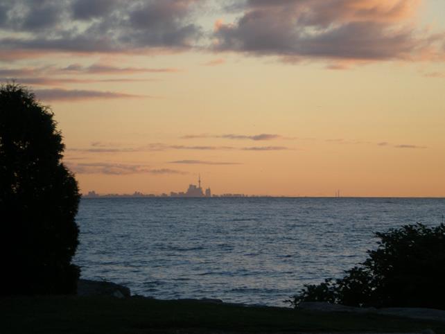 I Matt. 4:8, hvor Jesus fristes af Djævelen, tages Han med op på et meget højt bjerg og vises alle verdens riger og deres herlighed. Det kan jo ikke lade sig gøre på en globus, siger FTerne. Men det kan det heller ikke på en flad Jord - for grundet deres elskede perspektiv, vil alt blive så småt, at Jesus intet kunne se. Her er CN Tower fra Coronation Park i Oakville, 35 km. væk: