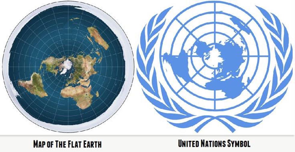 Et af FTernes helt store hammerslag er FNs logo, for de mener at FN med det, meget subtilt fortæller at de ved at Jorden er flad. Men vi har set at eliten, med lærdommene fra frimurerne, ved at Jorden er en kugle, og deres logo skal læses med samme okkulte forståelse.