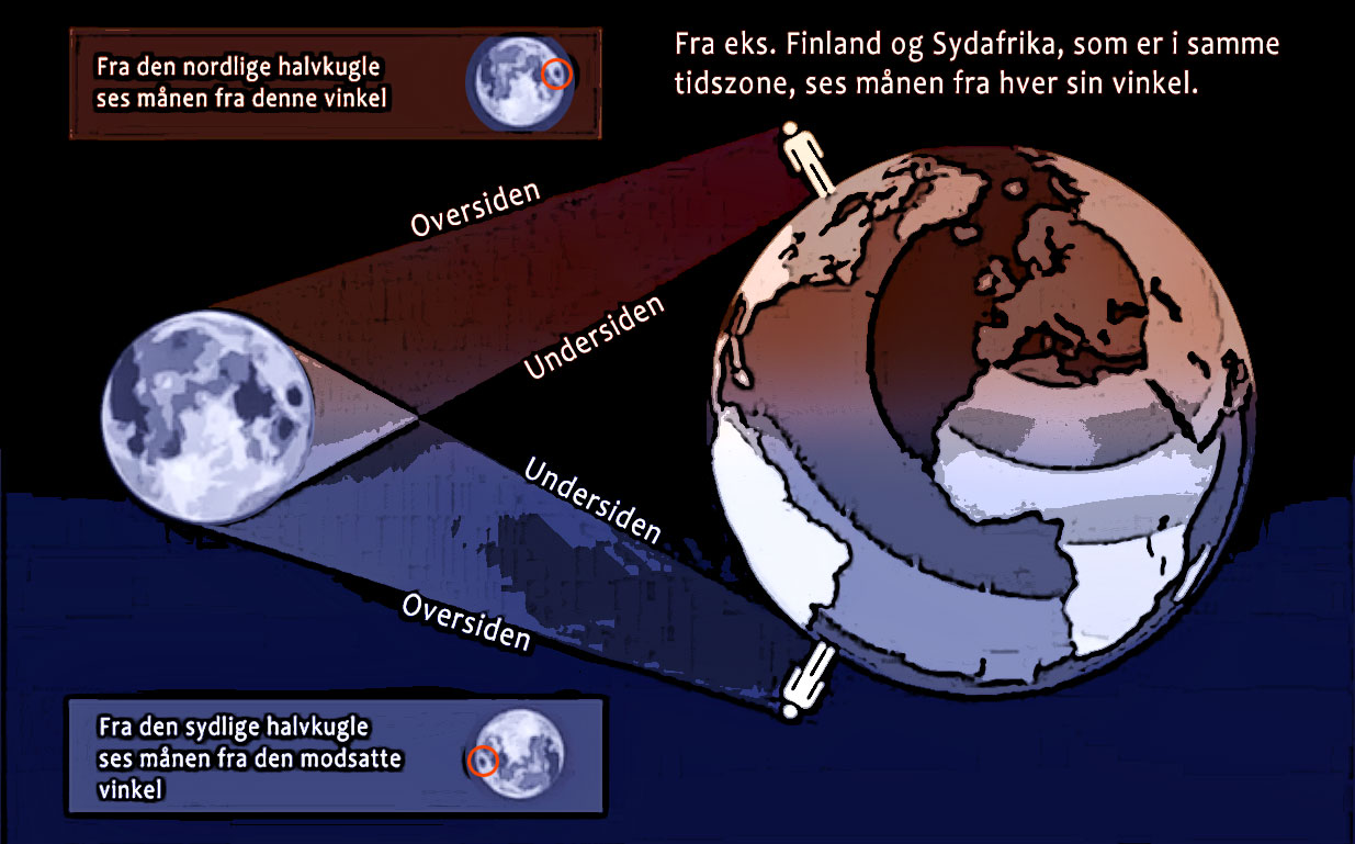 FTerne har sammen med solen rykket månen inden for Jordens skive, og det giver nogle seriøse problemer med det, vi observerer. Månen ses ens på hele kloden, er der nymåne ses det over hele verden. Ses fuldmåne på nordpolen, ses fuldmånen også på sydpolen - dog, fordi Jorden er en globe, ses månen roteret mellem nordpolen og sydpolen, som vist på billedet her: