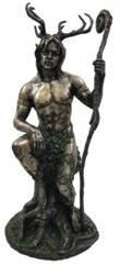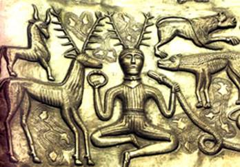 Bemærk på billedet, hvordan Herne er omgivet af skovens dyr, der i blandt en hjort / et rådyr. Er det ikke interessant, at vi tager skovens træer ind i vore stuer, til gaverne fra julemanden Herne? Herne blev anset for en guddommelig jæger, og det er sådan Bibelen beskriver Nimrod, solguden som julen handler om: ”En vældig Jæger for HERRENS Øjne” (1. Mos. 10:9). Bemærk staven som Herne har på billedet i midten. Det minder ganske godt om den let krummede stav, hvor den døde, korsfæstede Jesus hænger på, som paven, solgudens tjener, går rundt med (og hvorfor går han overhovedet rundt med sådan en stav?)
