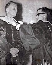 | Billy Graham modtager Roms bærestykke, på det romersk katolske universitet ”Belmont College”. Graham fik overdraget en honorær doktorgrad fra dette universitet og fortalte publikum at ”Evangeliet der grundlage dette universitet er det samme evangelium som jeg prædiker i dag” |