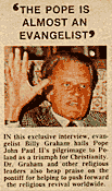 Den 11. oktober 1979, da Billy Graham var i Phil Donahue’s Show og diskuterede Pave Johannes Paul II’s besøg i USA, sagde han: ”Jeg tror det amerikanske folk ønsker en leder, en moralsk og åndelig leder som tror på noget. Og det gør han (paven). Han siger sin mening lige ud, om alle emner. Faktisk var hans emne i Boston virkelig evangelisk, hvori han bad mennesker komme til Kristus, at give deres liv til Kristus. Jeg sagde ’Tak Gud at jeg har en at citere, med en virkelig autoritet’.”
