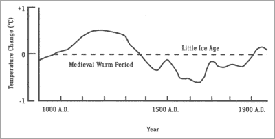 Igen ses at menneskeskabt global opvarmning ikke har nogen videnskabelig grobund. Påstanden om konsensus, enighed blandt dokumenter, forskere osv., er ganske enkelt direkte løgn. Men det er alt sammen er godkendt af Verdensordnens folk, som bruger løgn for at opnå et politisk mål. Det samme gælder IPCC’s behandling af tilgængelige data. Data kan tvinges til at sige hvad som helst, og det er præcis det, IPCC benytter sig af. Her er en oversigt[5] som IPCC i 1995 udgav for at vise temperaturen siden 1000 e.Kr., hvilket viser at klimaet altid forandrer sig: