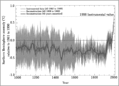 Bemærk hvordan den Middelalderlige Opvarmning (år 900-1300 e.Kr.) på det øverste skema er ca. lige så varm, som 1998 - som desuden var året hvor El Niño fænomenet sparkede temperaturen op. Bemærk også hvordan de aktuelle data er blevet til skygger, som tilmed trækkes langt ned under skærelinien, mens de ønskede data tvinges under skærelinien, for så at eksplodere på det ønskede tidspunkt.
