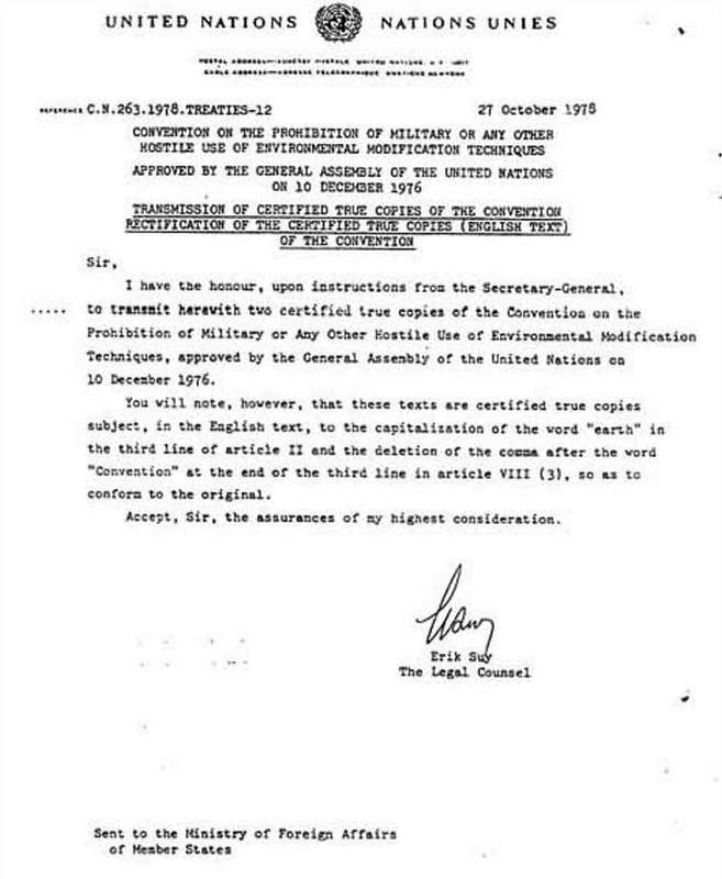 Her ses en skrivelse, godkendt af FNs generalforsamling d. 10-12-1976 og dateret 27-10-1978, sendt fra FN til USAs udenrigsministerie, med titlen, Konvention for forbydelse af militært eller nogen anden fjendtlig brug af miljømæssige modifikations teknikker: