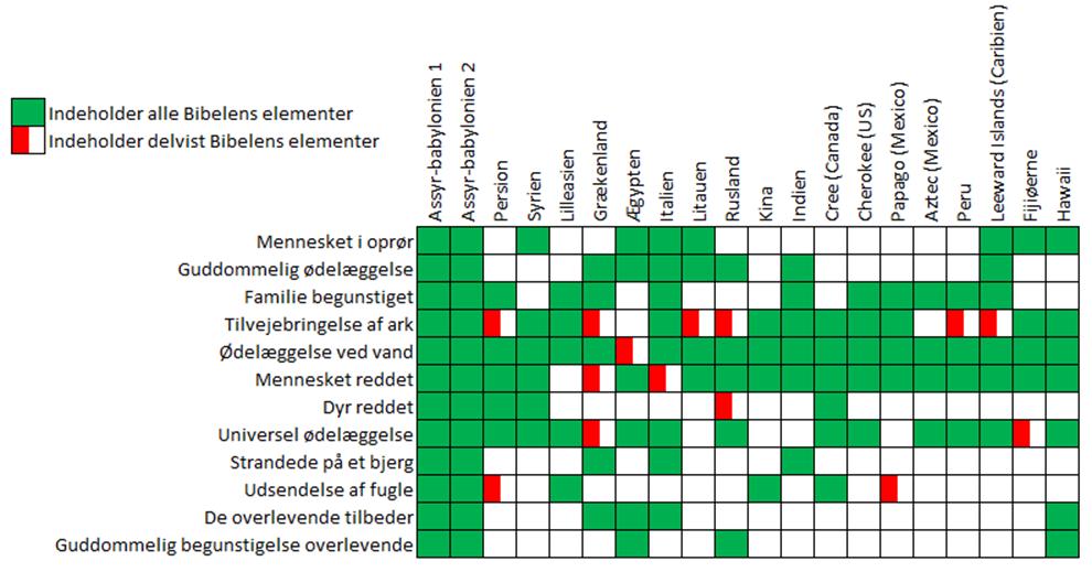 Der er ligheder, men også mange forskellige detaljer, der adskiller historierne. Tydeligt er det, at menneskeheden har oplevet en global syndflod. For god og hurtig oversigt, har jeg lavet en dansk version af et oversigtsskema herunder, som opsumerer ligheder og forskellige på en række fortællinger.