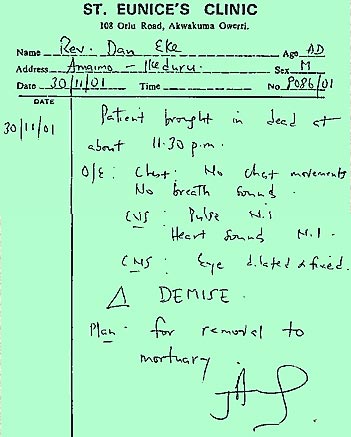 Doktoren skrev rapporten og dødsfaldet og spurgte om de ville anbringe Daniel på klinikkens ligkapel, hvilket de ikke ville men de flyttede ham til hans far, og derfra videre til Ikeduru General Hospitals ligkapel, ikke så langt derfra. Den lokale bedemand, Barlington R. Manu, tjekkede igen liget og klokken var over midnat 1:00 søndag morgen.