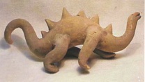 Hundredvis af disse figurer viste tydelige modeller af forskellige dinosaurtyper. Et af dem ses her til højre[43]. Mange af disse keramikfigurer [men ingen dinosaurfigurer] sendte disse arkæologer til videnskabelige dateringscentre i USA, bl.a. til ’Isotopes Incorporated’ i New Jersey, som udførte tre test med radiokarbon, og til Pennsylvania Universitet, som udførte nogle ’thermoluminecence dateringer’. Rapporterne fra dateringseksperterne kom tilbage med årstallene fra 4530 til 1640 år f. Kr. Da arkæologerne havde fået fastslået disse dateringer, sendte de derefter dinosauerfigurene til dateringseksperterne og fortalte, at de har fundet hundredvis af dinosaurfigurer sammen med de andre figurer, som allerede var dateret. Årsagen til, at de ikke sendte dem første gang, var måske frygten for, at dette ville påvirke en sand datering, som følgende da også viser: For de samme laboratorier, som tidligere havde dateret figurerne til nogle få tusinde år, fastsatte nu, at alle figurer kun at være 35 år gamle[44]. Der var ingen grund til at ændre på tallet, for fundene er bevidnet, men hvorfor skete det så? Årsagen er, at den etablerede videnskab retter sig ind efter udviklingslæren. Når udviklingslæren derfor lærer, at dinosaurerne døde millioner af år før mennesket kom til, så kan mennesker derfor hverken have set og lavet disse figurer for nogle tusinde år siden. I stedet for at anerkende, at udviklingslæren har taget fejl, konkluderes det i stedet, at der må være noget galt med analysen! Forklaringen er herefter, at de indfødte i Mexico har set billeder af dinosaurer i forrige århundrede, og har derefter selv lavet disse figurer og begravet dem – hvad de altså ikke har. Dette er en af utallige måder, hvorpå de søger bevidst at skjule, at mennesker og dinosaurer har levet på samme tid for nogle få årtusinder siden.