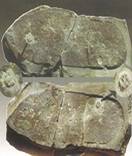 Derudover er der også fundet dinosaurer på forhistoriske begravelsessten, som fx den, der ses til højre herfor. Ser man godt efter, kan man se, at stenen er illustreret med en kriger, som rider på ryggen af en triceratop-dinosaur og prøver at hugge den med et økselignende våben[46]. Dette kan selvfølgelig også her kun betyde ét, nemlig, at der selvfølgelig levede mennesker samtidigt med dinosaur, og som derfor har udsmykket deres krukker, osv. med det, de har set.