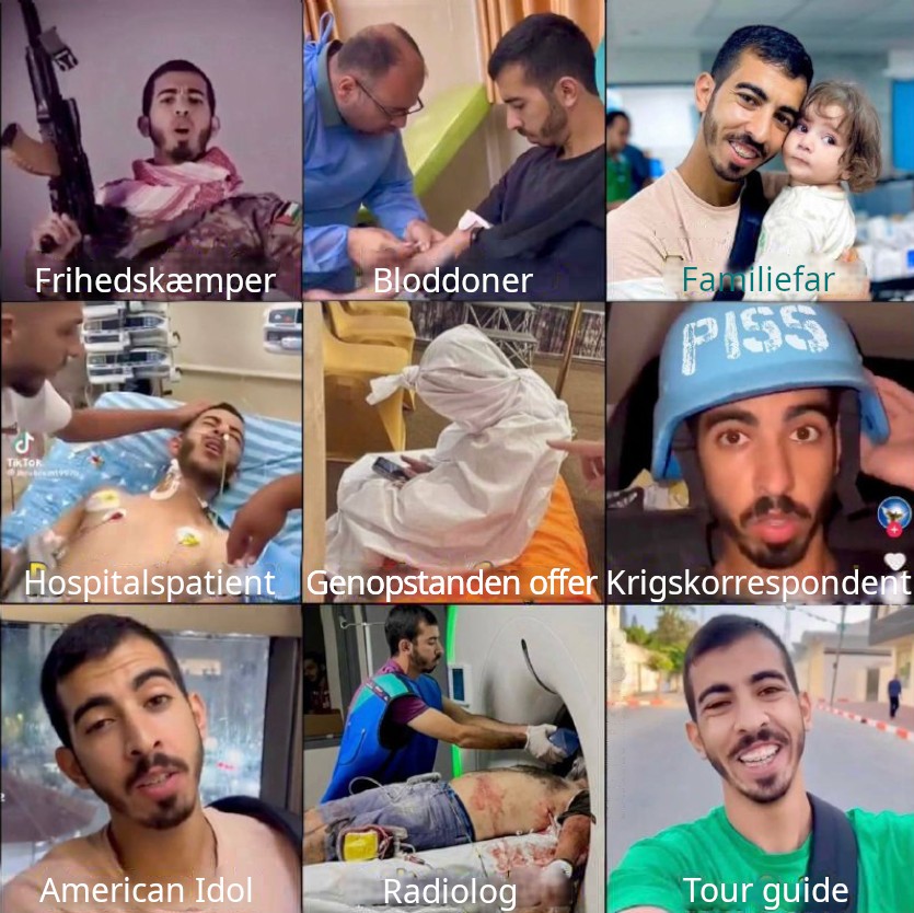 Tysk tv har udsendt et exposé om "journalisten" Saleh Al-Jaafari (Mr. Pallywood), der optræder i forskellige roller i Gaza, men stadig formår at sælge indhold til store mediekanaler i verden. Samme person er blevet fotograferet / filmet den ene dag som herodisk soldat, den næste som dødeligt såret på hospitalet, den tredje dag som omsorgsfuld familiefar osv.