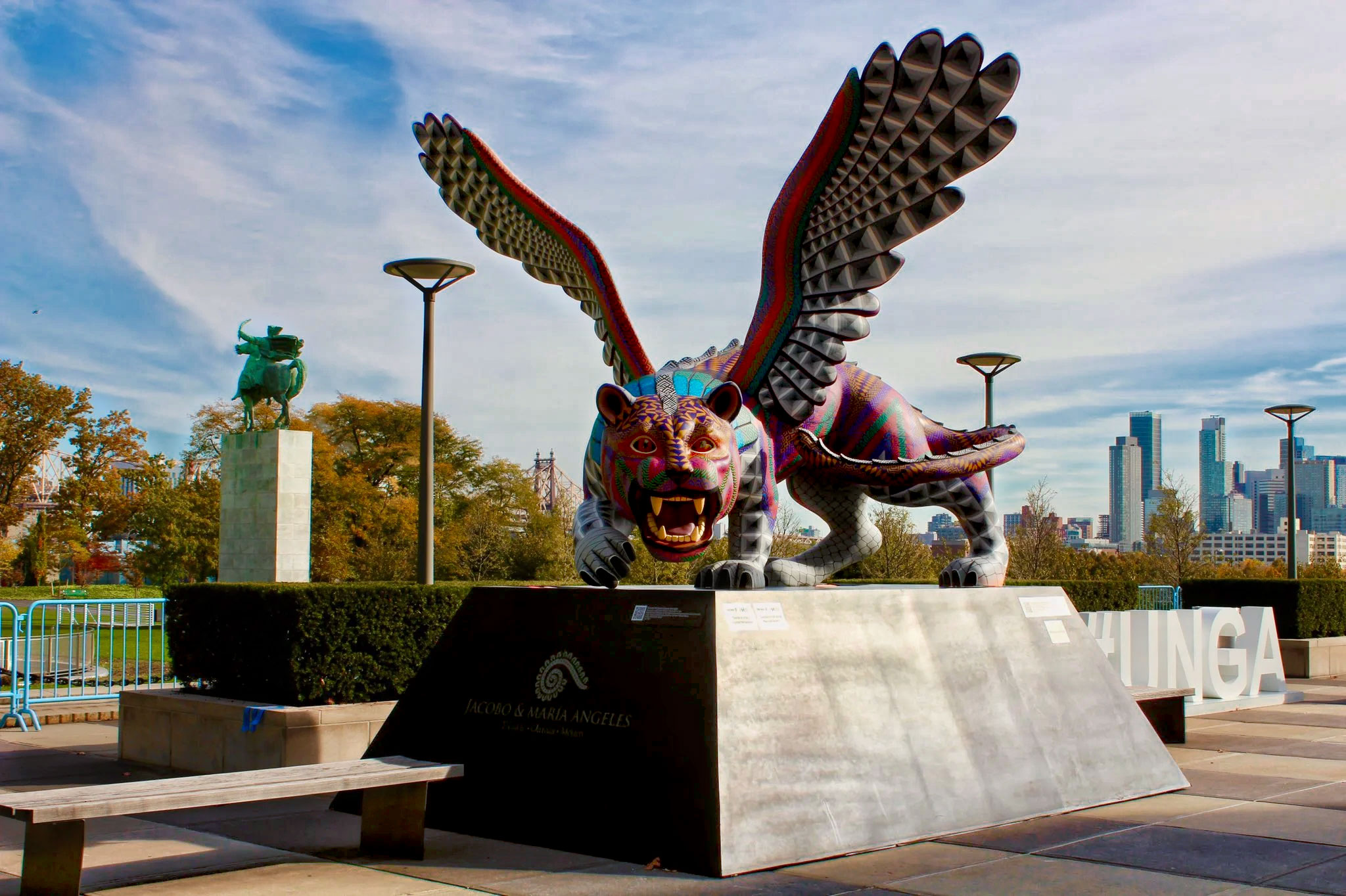 | “ | En vogter for international fred og sikkerhed står på Visitor's Plaza uden for #FN-hovedkvarteret. The Guardian er en fusion af jaguar og ørn og doneret af regeringen i Oaxaca, Mexico1 | ” |