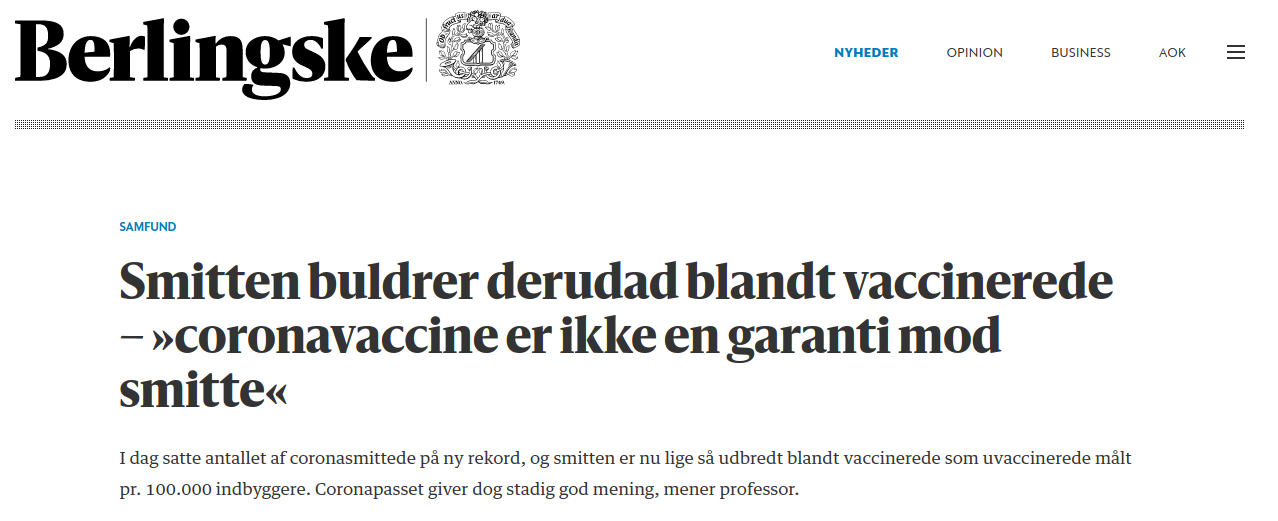 Post sandhed blev i 2016 årets ord4, og den tilstand har sidenhen infiltreret alle medier, fra elektroniske til materielle. Ind i mellem får medierne talt lidt over sig, men retter hurtigt ind, som eksemplet her med Berlingske Tidende, der d. 26-12-2021 skrev at: "I dag satte antallet af coronasmittede på ny rekord, og smitten er nu lige så udbredt blandt vaccinerede som uvaccinerede målt pr. 100.000 indbyggere. Coronapasset giver dog stadig god mening, mener professor", men kort efter - uden at informere at artiklen var redigeret, opblødte de sandheden og skrev, "I dag satte antallet af coronasmittede på ny rekord. En smitte der også rammer blandt vaccinerede. Coronapasset giver dog stadig god mening, mener professor."