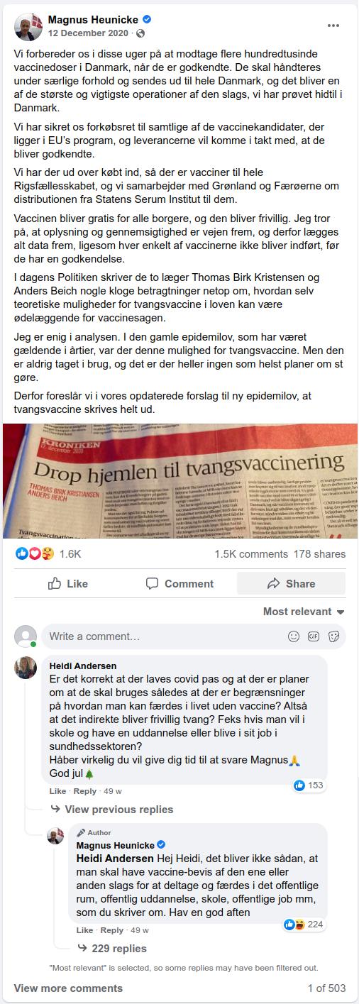 Vaccinerne virker og er de mest sikre og effektive Brostrøm har set i 30 år. Gem lige det i tanken. Det er ligesom da Heunicke d. 12. december lovede at der ikke kom tvungen vaccine eller vaccinepas2 - det kan vi også lige lade stå et øjeblik:
