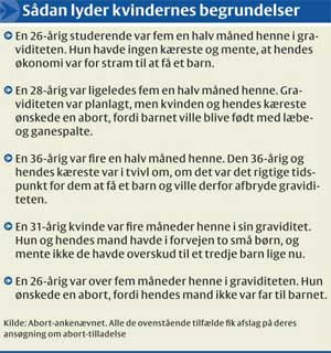 | “ | Maven er allerede vokset, og moderen kan mærke fosteret bevæge sig. Alligevel vælger danske kvinder at søge om tilladelse til at abortere raske fostre helt frem til femte eller sjette måned i graviditeten. 'Jeg har lige fået nyt arbejde', 'Jeg har ikke overskud for tiden', 'Vi har ikke plads', og 'Et barn mere er for dyrt.' Sådan lyder nogle af begrundelserne...I 2007 søgte 869 kvinder om at få en abort efter 12. uge af graviditeten. I 2007 fik 51 afslag på deres ansøgning om abort, mens 818 fik lov til at abortere deres foster. | ” |