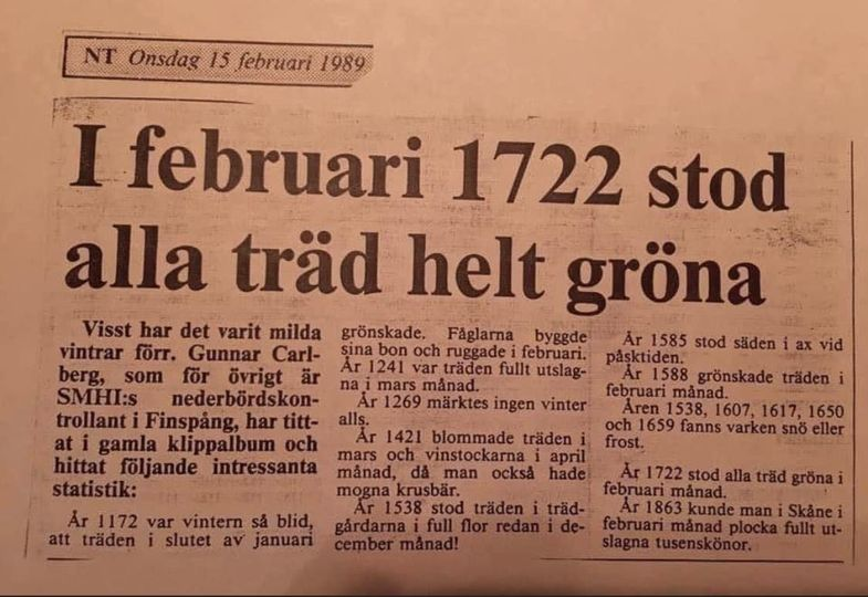 | “ | - I 1172 var vinteren så mild, at træerne blev grønne i slutningen af januar. Fuglene byggede deres reder og rugede i februar.- I 1241 blev træerne fuldt udsprunget i marts måned. - I 1269 mærkede man slet ingen vinter. - I 1421 blomstrede træerne i marts og vinstokkene i april, hvor der også var modne stikkelsbær. - I 1538 stod træerne i haverne i fuldt flor allerede i december! - I 1585 stod kornet i aks ved påsketid. - I 1588 blev træerne grønne i februar måned. - I årene 1538, 1607, 1617, 1650 og 1659 var der hverken sne eller Frost. (Bemærk, at nogle af de usædvanligt varme år fandt sted i 1600 tallet, altså i den dybeste kolde periode af den 'Lille istid) - I 1722 var alle træer grønne i februar måned. - I 1863 kunne man i februar plukke fuldt blomstrede tusindfryd i Skåne. | ” |