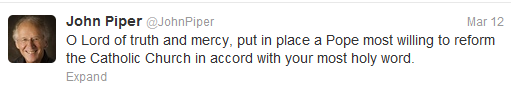 Her er Warrens ord oversat: "Velkommen pave Francis, kardinal Jorge Mario Bergoglio, Habemus Papam du har vore bønner" (Habemus Papam betyder "Vi har en pave"). Før den nye pave blev valgt skrev Warren: "Vær med mig i dag i faste og bøn for de 115 kardinaler som søger Guds vilje for en ny leder" og "Ikke alt som er anderledes er dæmonisk. Lær at sætte pris på forskelle. Øjensynligt, Gud elsker variationer".