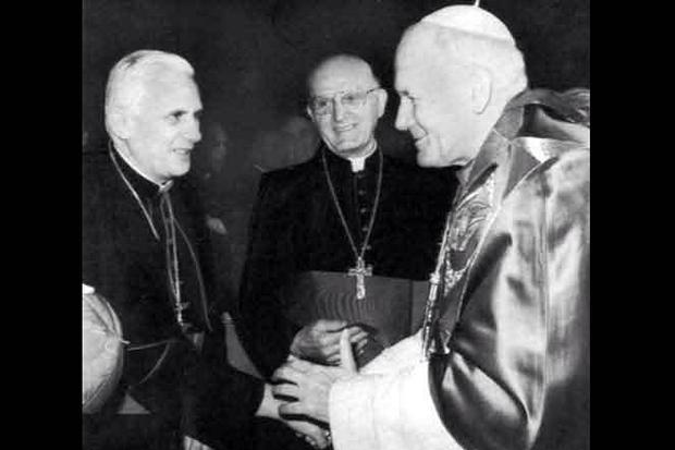 Billedet her taler for sig selv. Her ses de tre sidste paver - Johannes Paul II, der giver hånd til den næste pave, Ratzinger, hvilket overværes af nuværende pave, Bergoglio.