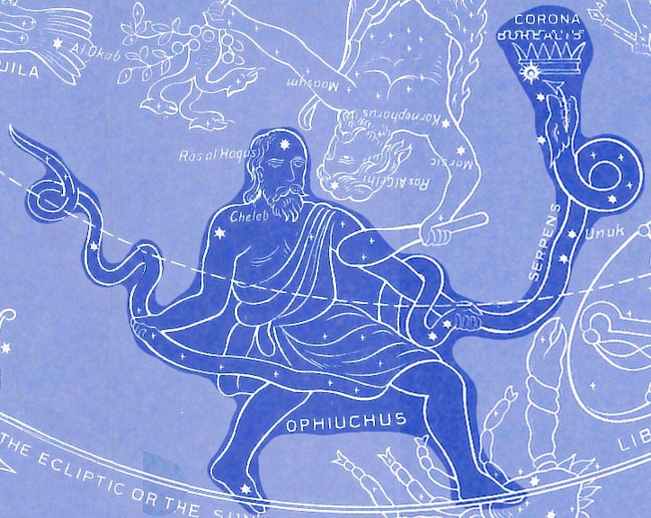 Slangeholden (Ophiuchus også identificeret som Asclepius) er i den græske mytologi en person, kendt som læge og medicinens gud. Han lærte om planternes medicinale kraft, da han slog en slange ihjel, for der kom en anden slange og genoplivede den med urter. Han lærte endda selv med tiden at genoplive de døde. Men Hades blev vred over alle de sjæle hans domæne ikke fik, og lokkede Zeus til at slå Asclepius ihjel med et lyn. Zeus placerede ham, som ærefuld tilkendegivelse af hans helbredende evner, på himmelen blandt sine slanger.
