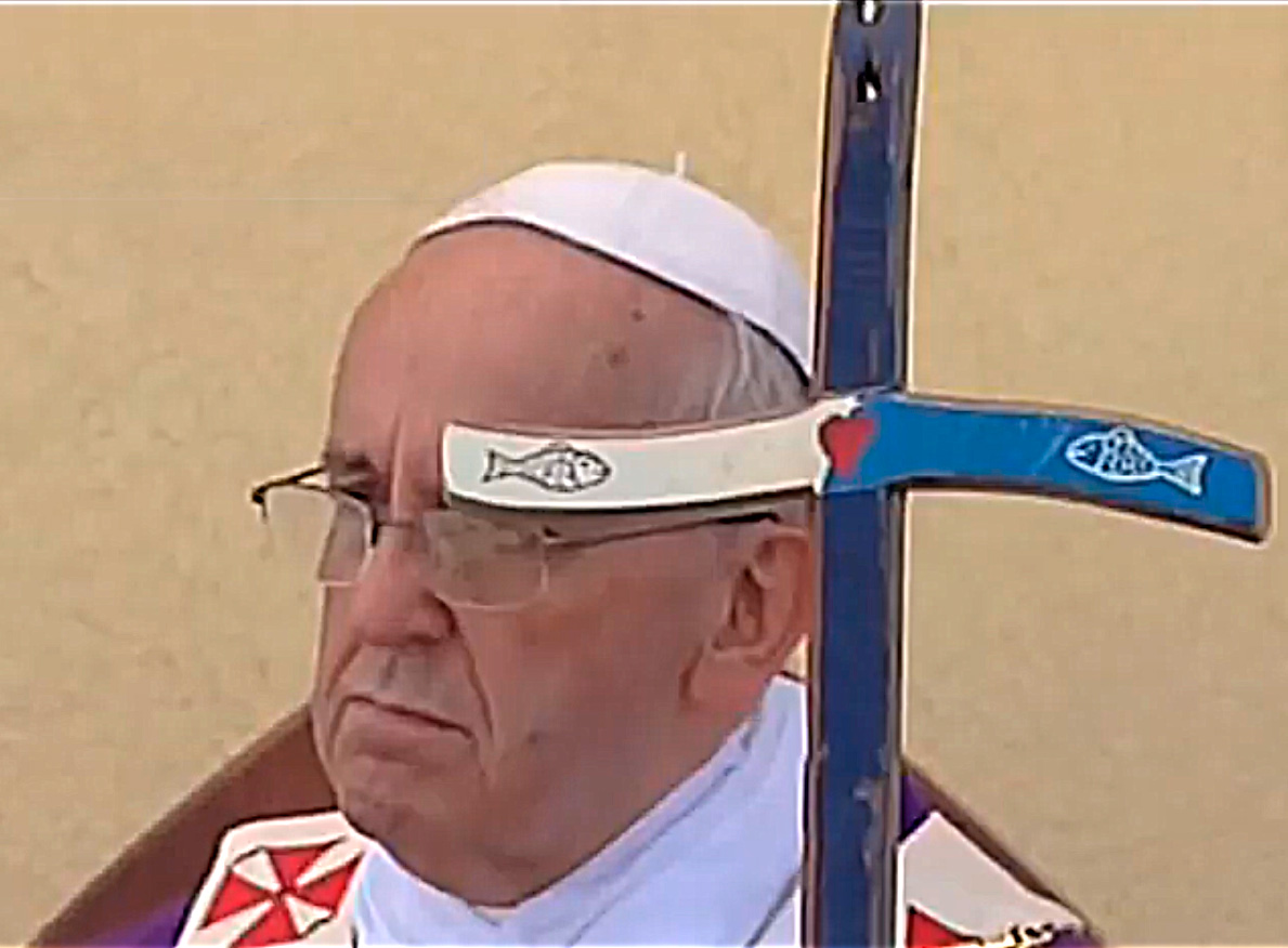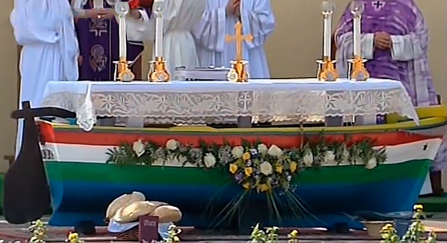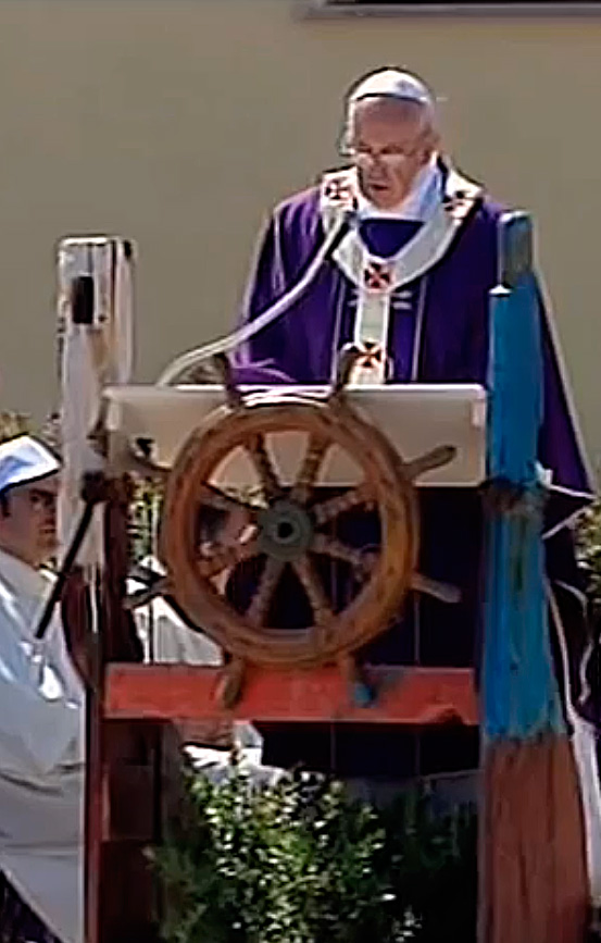 Til ceremonien, der blev holdt d. 08-07-2013, var alteret placeret på et replika af en båd, og på talerstolen var der påsat et "ror". Ligeledes havde Bergoglio taget et blåt-hvidt fiske kors med.
