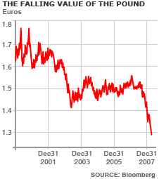 Det er ikke kun dollaren, der falder imod euroen. Også pundet mister sin styrke.| “ | Pundet har nået endnu en bundrekord imod euroen...til 5% fra 5,25%, et pund var kun 1,2457 euro værd tidligt torsdag. Sterling styrkedes senere en smule, med et pund for 1,2469 euro. | ” |